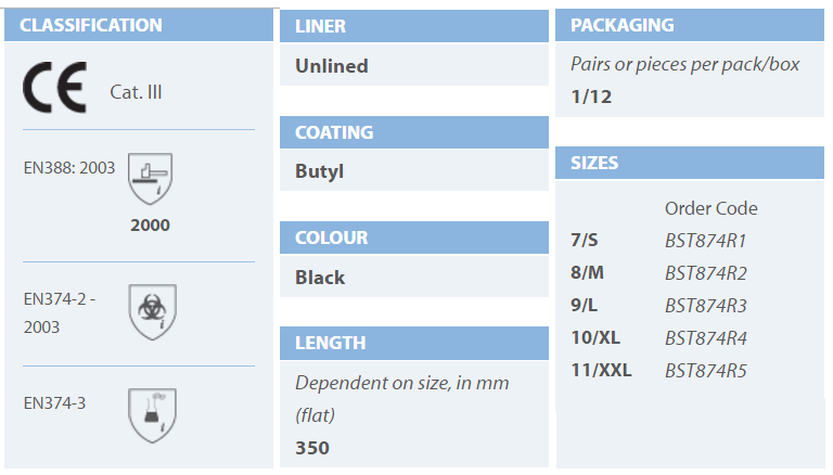 – Butyl coated gloves – Patterned appearance, good anti-slip, resistant to abrasion. – Protects against dangerous chemicals MEK, acetone and acid. – Thickness 0.35 mm. – Length 35 cm. – Available in sizes M, L, XL. – Suitable for petrochemical industry. – Received standards CE, EN388, EN374-2, EN374-3