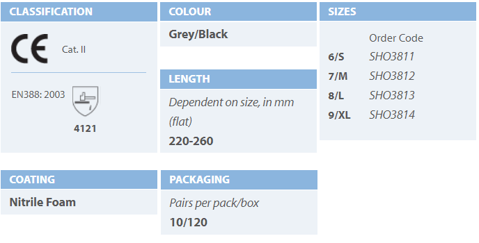 – Microfiber cloth gloves Seamless woven Good ventilation – Nitrile foam coating on the palm Excellent anti-slip – There is a pattern on the palm to increase efficiency in gripping the hand. – Resistant to punctures and tears. – Suitable for holding small parts. and work with little oil – Gray with black coating – Size S,M,L,XL