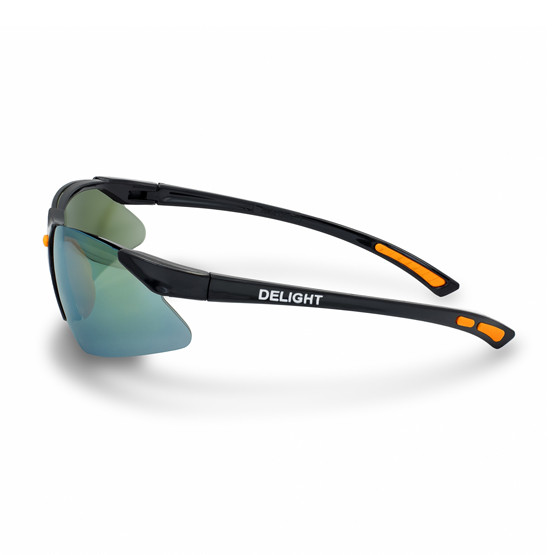 – Safety glasses with gray lenses coated with mercury orange, sporty shape, curved design to fit the face, suitable for Asian faces.