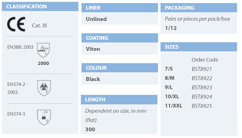 – Butyl gloves coated with Viton – Smooth surface appearance It is resistant to corrosion. – Protects against dangerous chemicals such as benzene, twooene or Xylene and solvents. – Thickness 0.30 mm. – Length 30 cm. – Available in sizes M, L, XL. – Suitable for petrochemical industry. – Received standards CE, EN388, EN374-2, EN374-3
